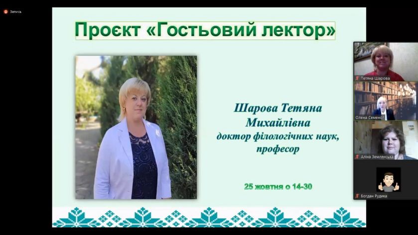Тетяна Шарова читала лекцію здобувачам вищої освіти ІІ курсу на запрошення завідувача кафедри української мови і літератури Сумського державного педагогічного університету імені А.С. Макаренка, доктора педагогічних наук, професора Олени Семеног. Лекція була проведена відповідно до проєкту «Гостьовий лектор».