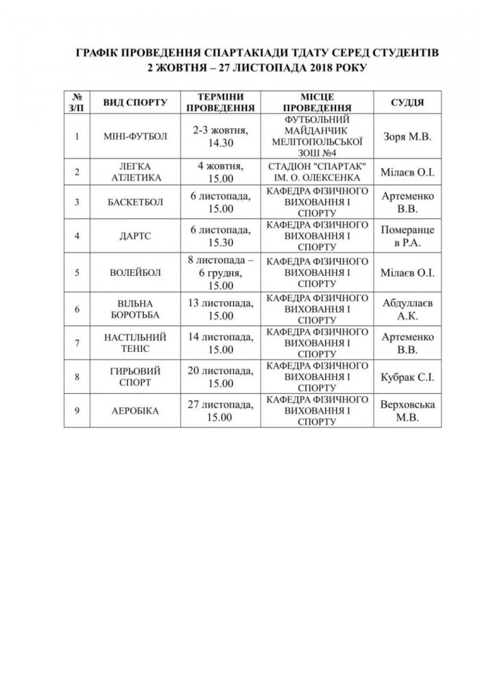 Графік проведення спартакіади ТДАТУ 2.10.2018 До вашої уваги графік проведення спартакіади, яка відбудеться у жовтні – листопаді 2018 року.
