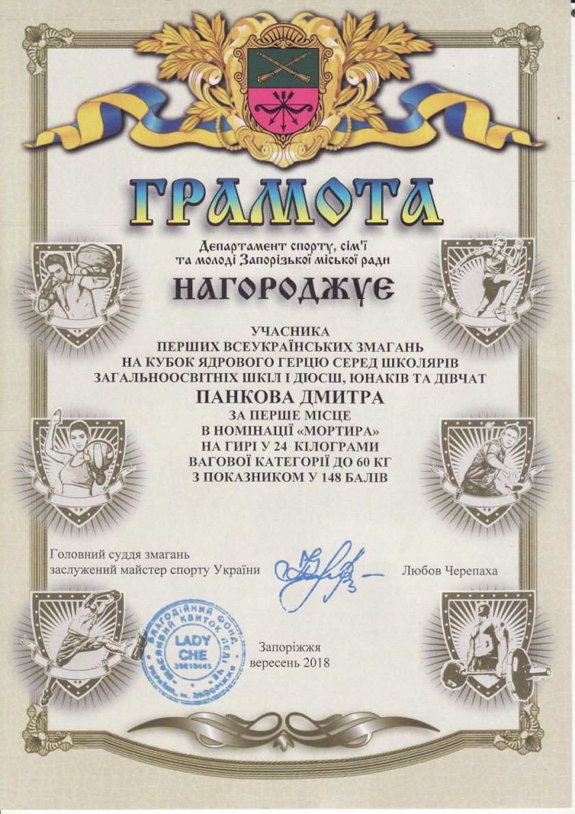 ПАНКОВ ДМИТРО, студент енергетичного факультету (22 група спеціальності “Електроенергетика, електротехніка та електромеханіка”) – І місце у номінації “Мортира” ( вага гир – 24 кг, вагова категорія – до 60 кг); результати: поштовх 2 гир – 68 разів, ривок гирі – 80 разів, сума – 148 балів. Дмитро в черговий раз підтвердив спортивне звання кандидата в майстри спорту України з гирьового спорту. Підготував спортсмена тренер Приазовської ДЮСШ, майстер спорту з гирьового спорту України КОНОВАЛЕНКО ДЕНИС ГЕННАДІЙОВИЧ.