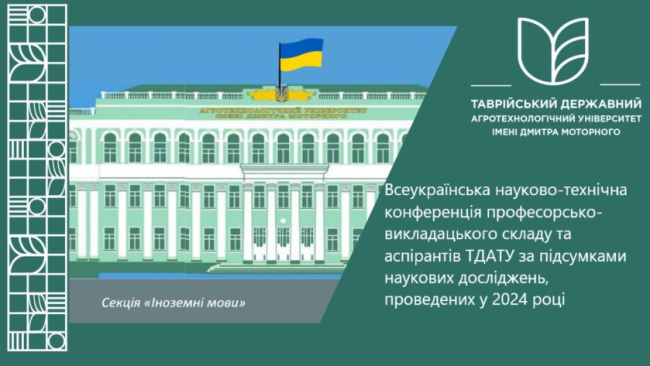 Кафедра “Іноземні мови” Таврійського державного агротехнологічного університету імені Дмитра Моторного успішно провела секційне засідання, присвячене актуальним питанням мовознавства, методики викладання іноземних мов та культурологічним аспектам мовної комунікації, в рамках Всеукраїнської науково-технічної конференції професорсько-викладацького складу та аспірантів ТДАТУ за підсумками наукових досліджень, проведених у 2024 році.