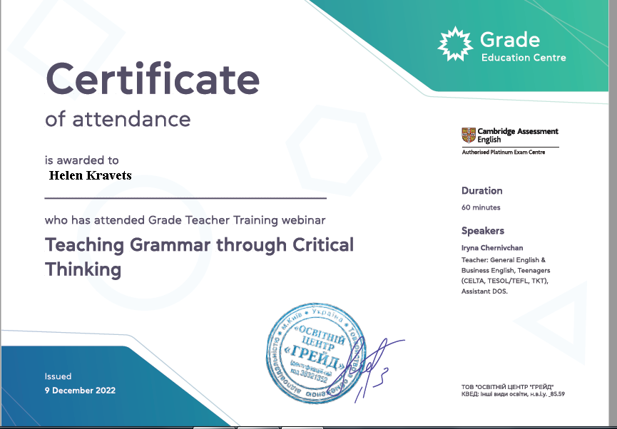 - Прийняла участь у вебінарі від Grade Education Centre за темою «Teaching Grammar through Critical Thinking» 9.12.2022
