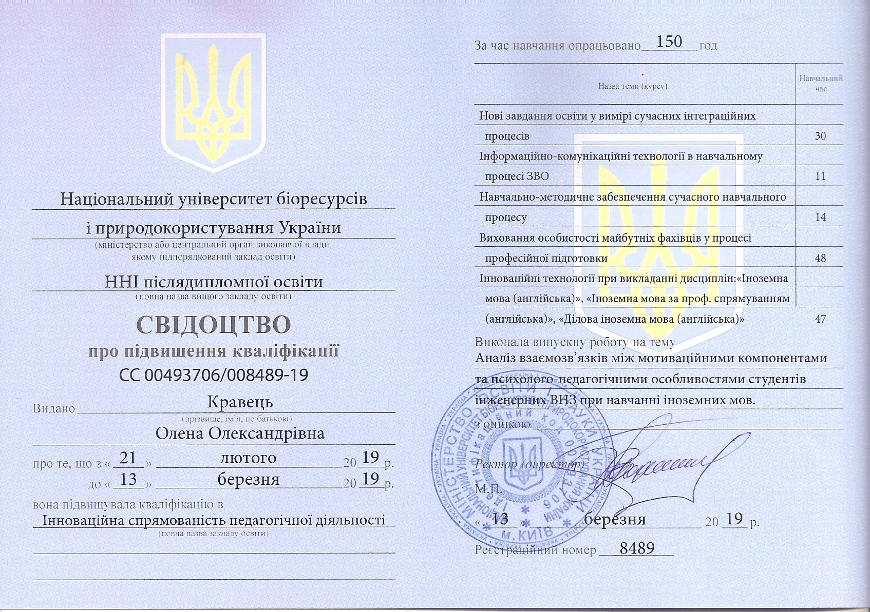- Пройшла підвищення кваліфікації у Навчально-науковому інституті післядипломної освіти Національного університету біоресурсів і природокористування України за навчальною програмою підвищення кваліфікації семінару “Інноваційна спрямованість педагогічної діяльності”, 150 годин, свідоцтво № СС00493706/008489-19 від 13 березня 2019р.