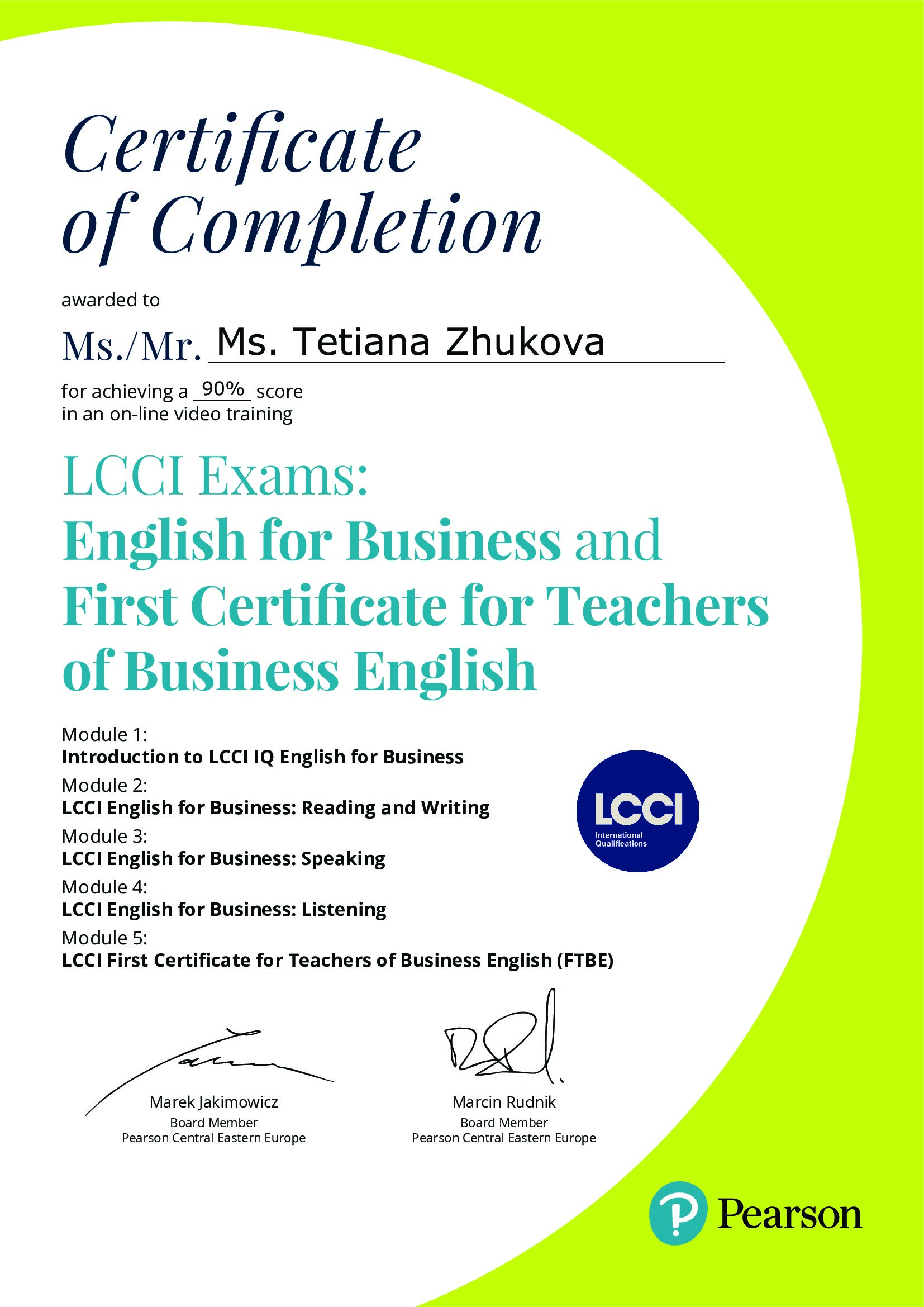 - English for Business and First Certificate for Teachers of Business English (Certificate of Completion LCCI Exams)