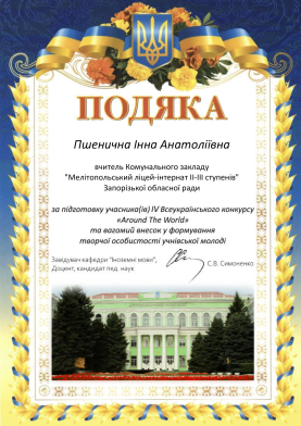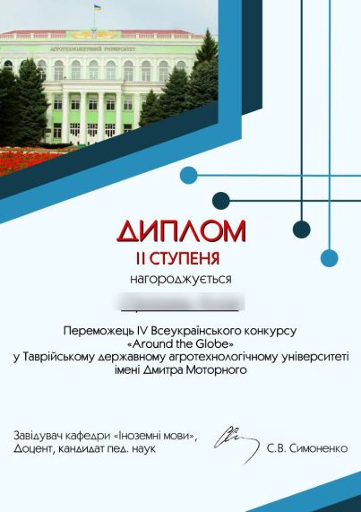 Диплом ІІ ступеня – «Ukrainian diaspora around the world» (учениці КЗ “Мелітопольський ліцей-інтернат ІІ-ІІІ ст.” ЗОР )