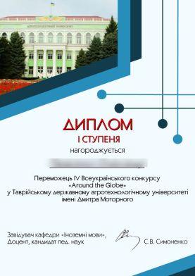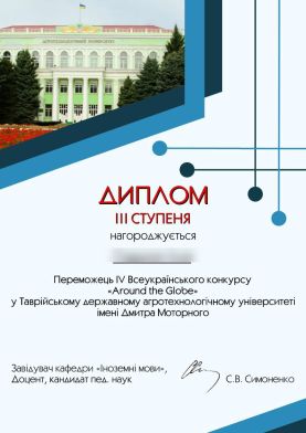 Диплом ІІІ ступеня – «Ukrainian diaspora in Germany» (учня Мелітопольського ліцею №10)