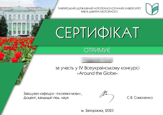 З січня до 20 травня 2023 року кафедрою «Іноземні мови» було організовано та проведено ІV Всеукраїнський конкурс «AROUND THE GLOBE» серед учнів 9-11 класів. Під час окупації міста Мелітополь військами РФ та воєнних дій у країні учасники змогли створити свої конкурсні плакати. Темою цьогорічного конкурсу була «Українська діаспора у країнах світу». На конкурс було представлено англомовні плакати (постери) від учнів закладів середньої освіти різних регіонів України.