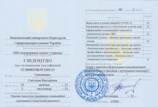 Напрацювання слухачів, їх практичний досвід з особливостей викладання дисциплін для здобувачів першого, другого та третього ступенів вищої освіти було відображено у випускних роботах. За результатами проходження курсів науково-педагогічні працівники кафедри зав.каф., к.пед.н., доц. Симоненко С.В., викладач-стажист Нікіренкова А.Ю. отримали свідоцтва.