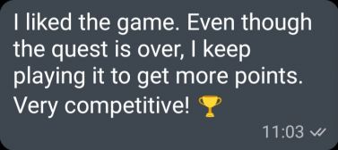 За результатами заходу було отримано позитивний фідбек від учасників. Вони відмітили зручність такого формату, адже проходити квест можна в будь-який час та в будь-якому зручному місці. Крім того, в них є можливість працювати як індивідуально, так і в командах, обмінюватись враженнями та порівнювати свої здобутки (отримані бали).