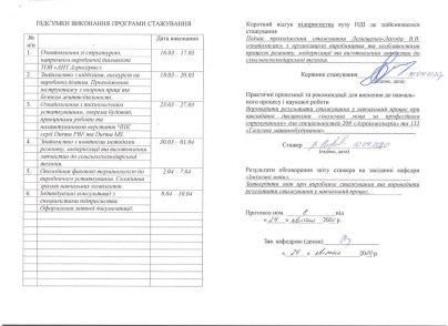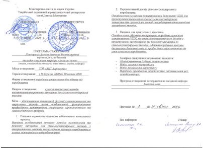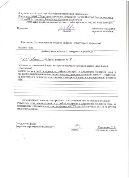 За результатами захисту стажування було вирішено впровадити результати стажування у навчальний процес при викладанні дисципліни «Іноземна мова за професійним спрямуванням» для спеціальностей 208 «Агроінженерія» та 133 «Галузеве машинобудування».