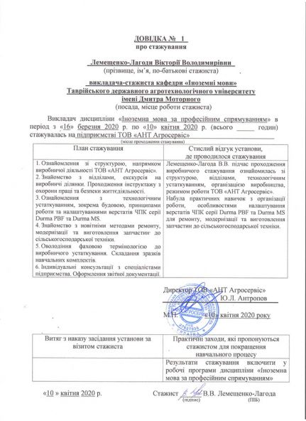 Цієї весни у рамках програми підвищення кваліфікації викладач-стажист кафедри «Іноземні мови» В.В. Лемещенко-Лагода пройшла стажування у ТОВ «АНТ Агросервіс», основна діяльність якого пов’язана з виготовленням та ремонтом запчастин для сільськогосподарської техніки.