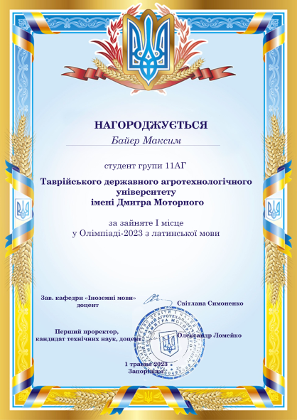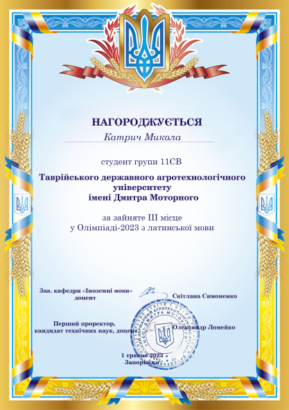 З 25 до 30 квітня 2023 року старший викладач кафедри «Іноземні мови» Ірина КРИВОНОС підготувала та організувала проведення щорічної олімпіади з дисципліни «Латинська мова» серед студентів факультету АТЕ, спеціальності «Агрономія» і «Садівництво та виноградарство» дистанційно на освітньому порталі Таврійського державного агротехнологічного університету імені Дмитра Моторного.