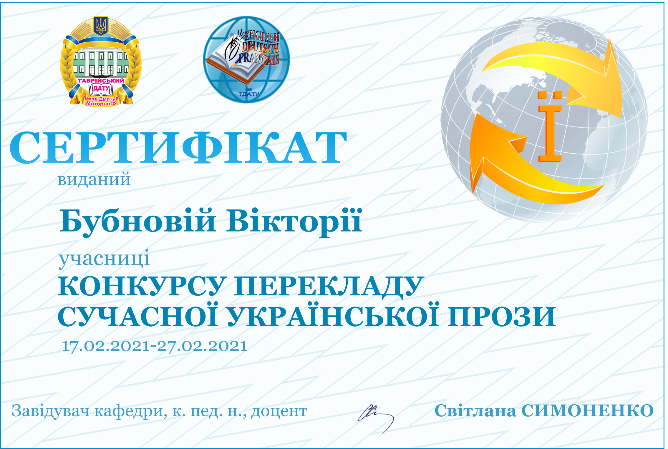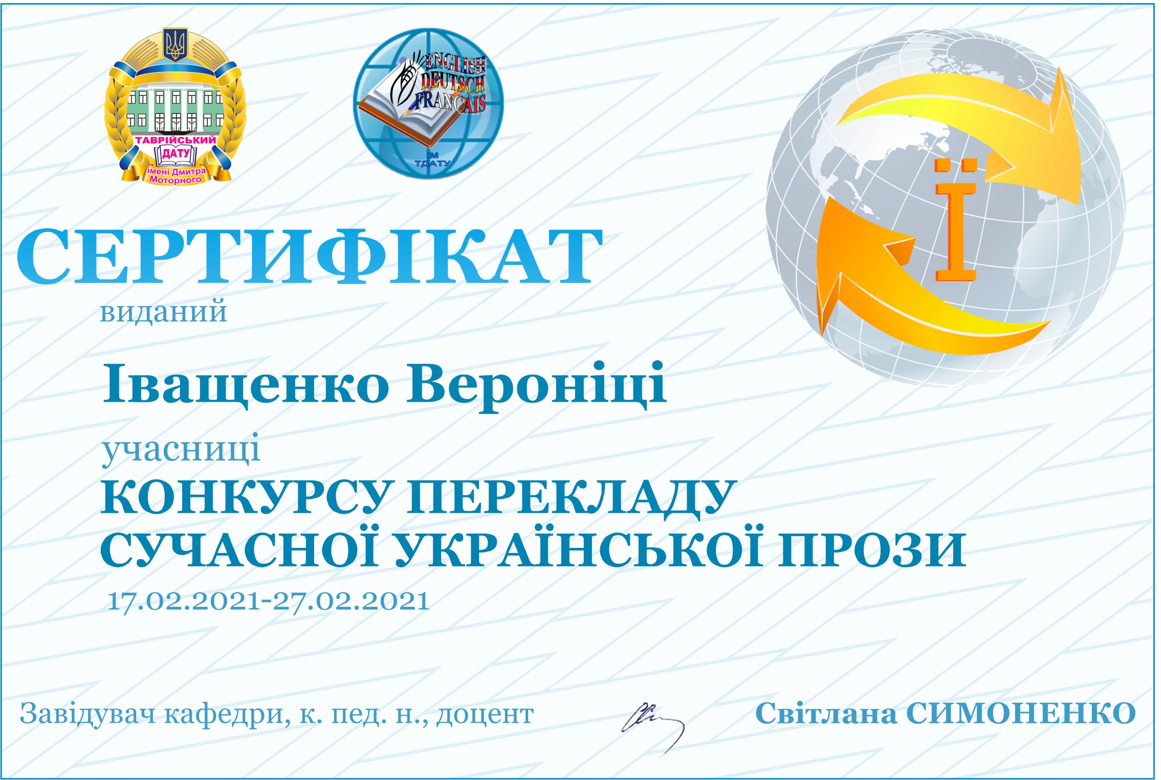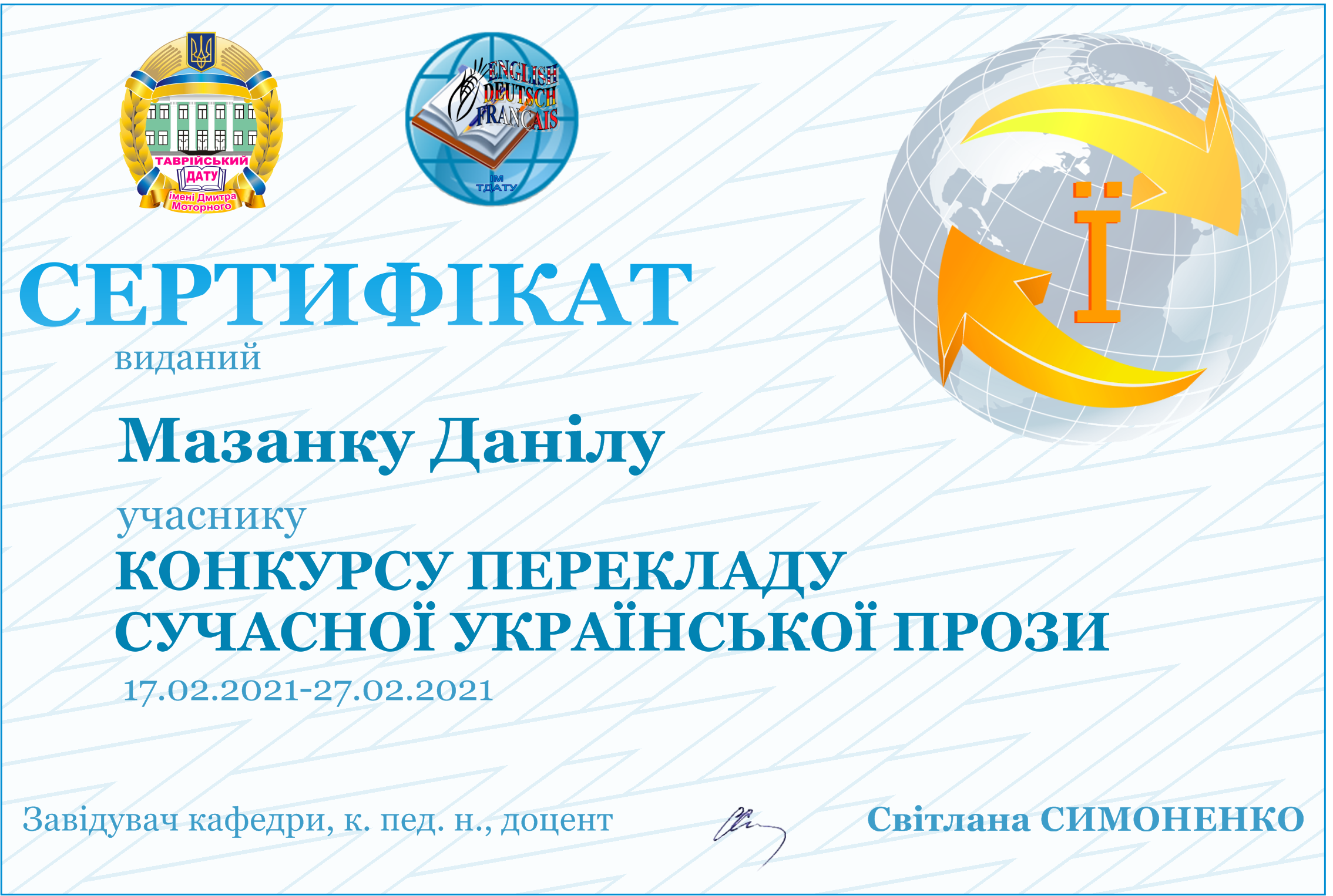 ПЕРЕКЛАД ПЕРЕМОЖНИЦІ КОНКУРСУ У СЕКЦІЇ АНГЛІЙСЬКОЇ МОВИМАНІЛО АНАСТАСІЇ |