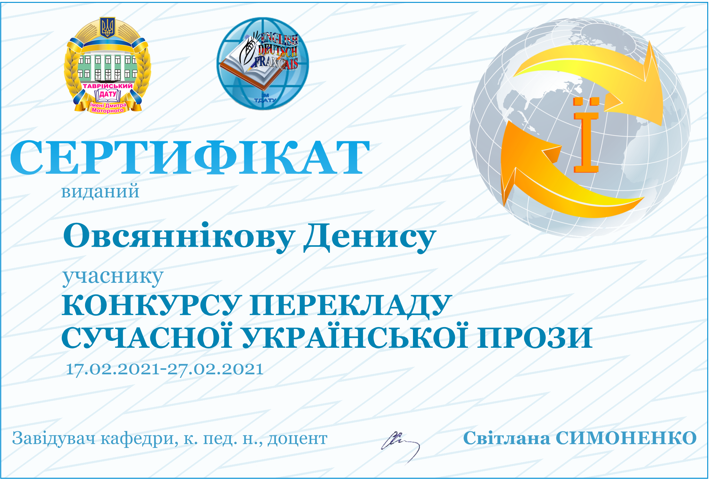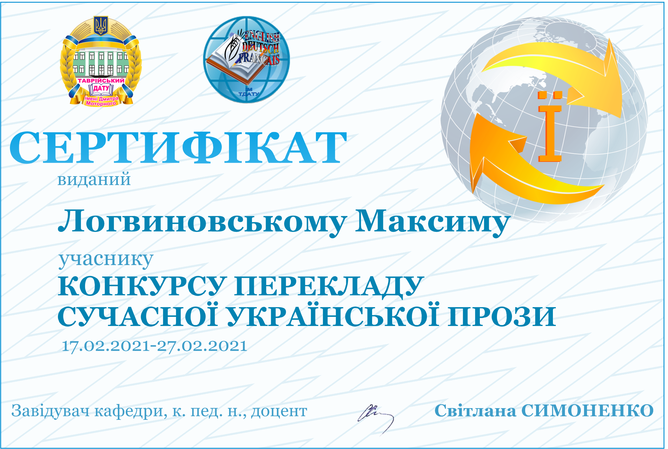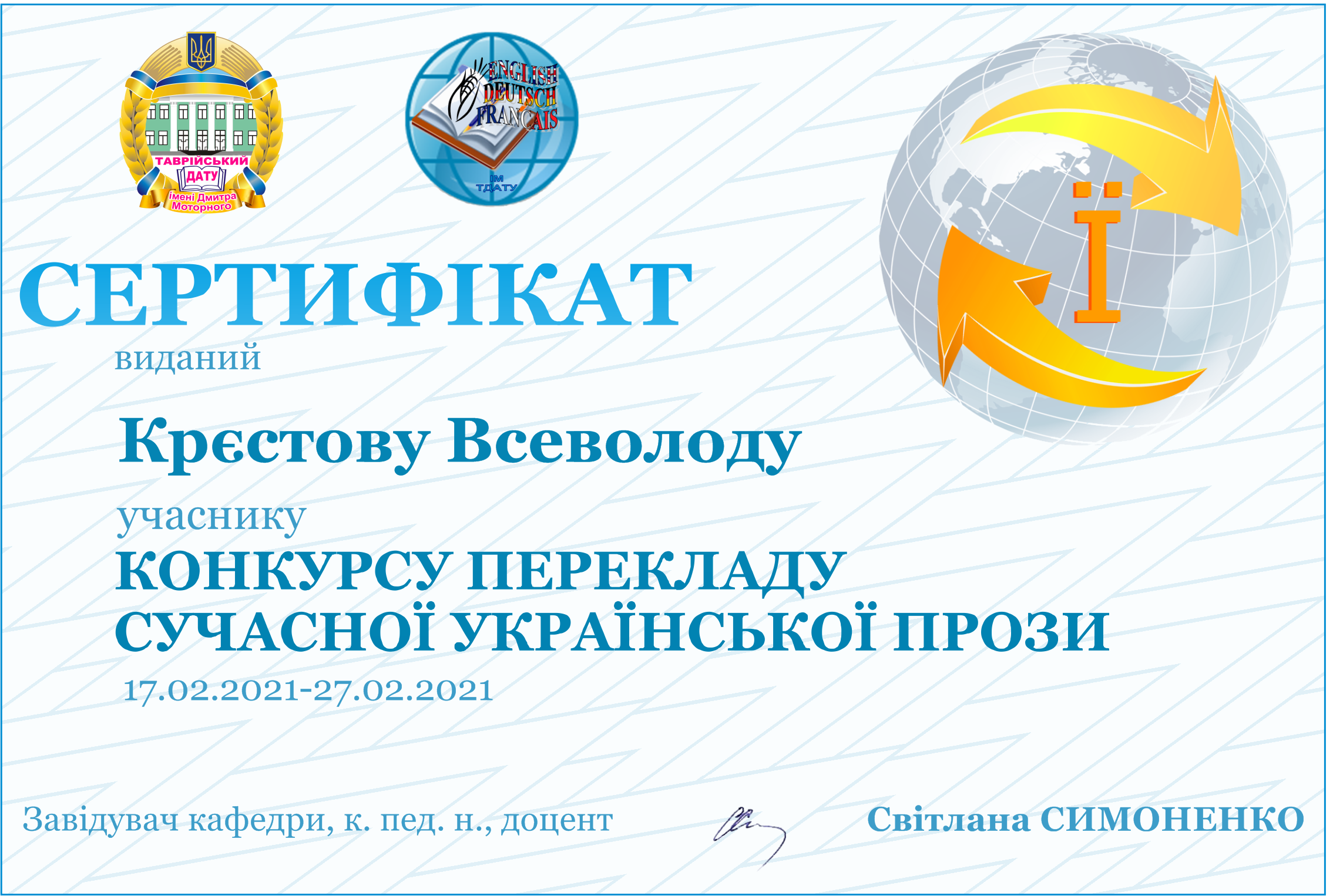 ПЕРЕКЛАД ПЕРЕМОЖНИЦІ КОНКУРСУ У СЕКЦІЇ АНГЛІЙСЬКОЇ МОВИМАНІЛО АНАСТАСІЇ |