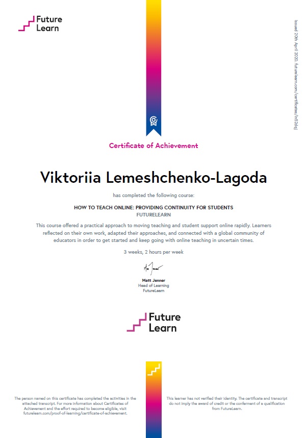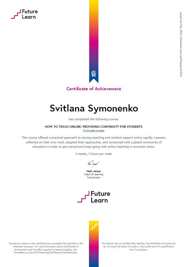 З метою пошуку та імплементації нових методів навчання у освітній процес, а також розширення можливостей самореалізації у своїй професійній діяльності, завідувачка кафедри «Іноземні мови» Симоненко С.В., а також викладачі кафедри – Кривонос І.А. та Лемещенко-Лагода В.В. успішно завершили дистанційні курси від університетів та освітніх організацій Великобританії та США на онлайн-платформі масових відкритих освітніх курсів FutureLearn.