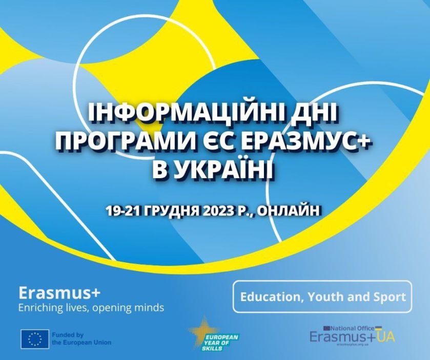 Національний Еразмус+ офіс в Україні спільно з Представництвом ЄС в Україні (tbc), Міністерством освіти і науки України (tbc), Міністерством молоді та спорту України, Національним агентством із забезпечення якості вищої освіти (tbc), Національним агентством кваліфікацій, Інформаційним центром Еразмус+ молодь та Європейського корпусу солідарності та з іншими партнерами запрошують 19-21 грудня 2023 р. приєднатись до Інформаційних Днів Програми Європейського Союзу Еразмус+ в Україні у сферах освіти, молоді та спорту, що відбудуться під егідою European Year of Skills 2023.