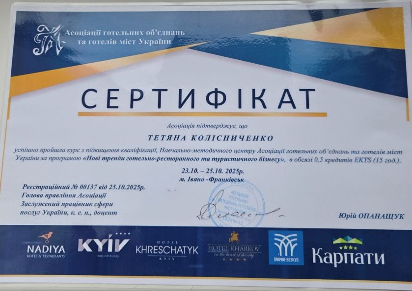 Доцентка кафедри харчових технологій та готельно-ресторанної справи Таврійського державного агротехнологічного університету імені Дмитра Моторного Тетяна Колісниченко взяла участь у роботі Всеукраїнського форуму профільних навчальних закладів індустрії гостинності «Нові тренди індустрії гостинності», організованого Асоціацією готельних об’єднань та готелів міст України.