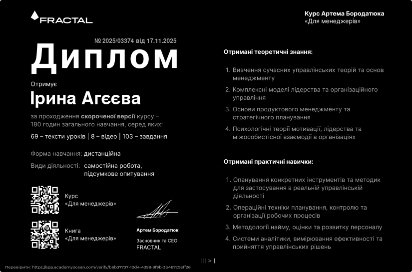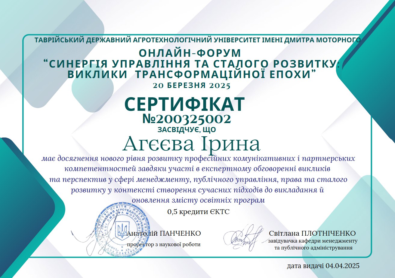 ГО “Прогресильні”, WINWIN AI Center of Excellence при Мінцифри. Сертифікат про підвищення кваліфікації №ВКШІО-0011 від 23.06.2025 р. Тема: “Великий курс про ШІ в освіті”, обсягом 45 годин (1,5 кредиту ЄКТС). Визнано підвищенням кваліфікації (наказ ректора ТДАТУ №355-ІПК від 06.10.2025 р.)