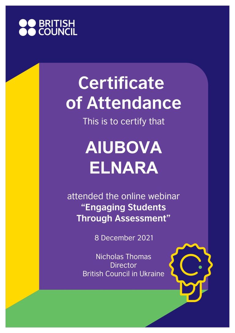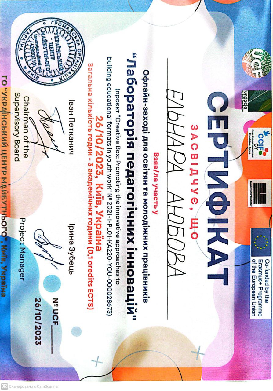 ГО «Український центр майбутнього» (м.Київ, Україна). Сертифікат про участь в онлайн-заході, отриманий 26.10.2023 р. Тема: «Лабораторія педагогічних інновацій» (проєкт «Creative Box: promoting the innovative approaches to building educational formats in youth work»), обсягом 3 години (0,1 кредити ЄКТС). Визнано підвищенням кваліфікації (наказ №449-ІПК від 28.12.2023 р.)