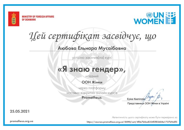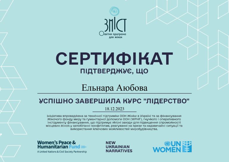 ООН Жінки в Україні (м. Київ, Україна). Сертифікат про завершення курсу, виданий 18.12.2023 р. Тема: «Лідерство» (за фінансування Жіночого фонду миру та гуманітарної допомоги ООН (WPHF)), обсягом 1 година (0,03 кредиту ЄКТС). Визнано підвищенням кваліфікації (наказ ректора № 243-ІПК від 30.06.2025 р.)