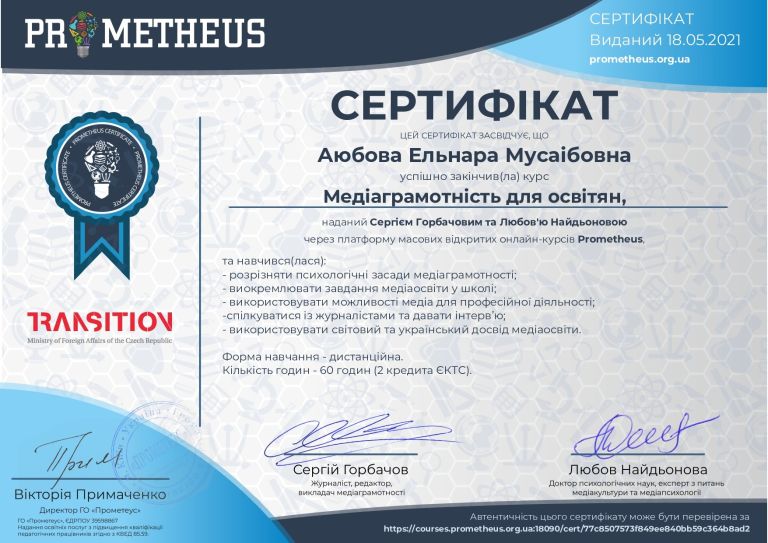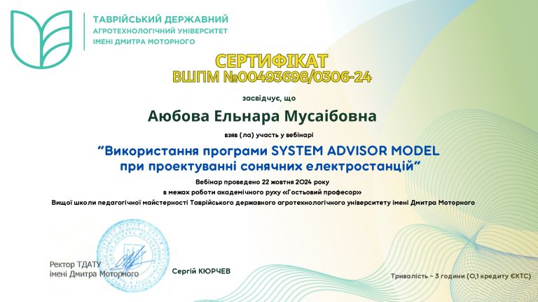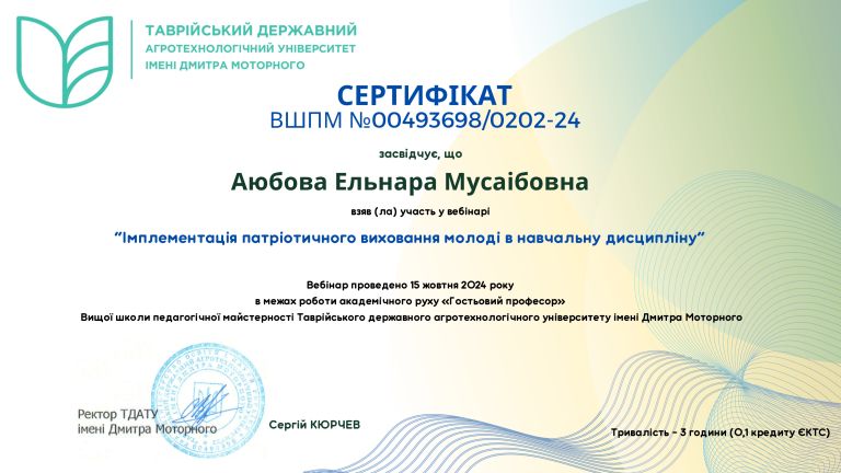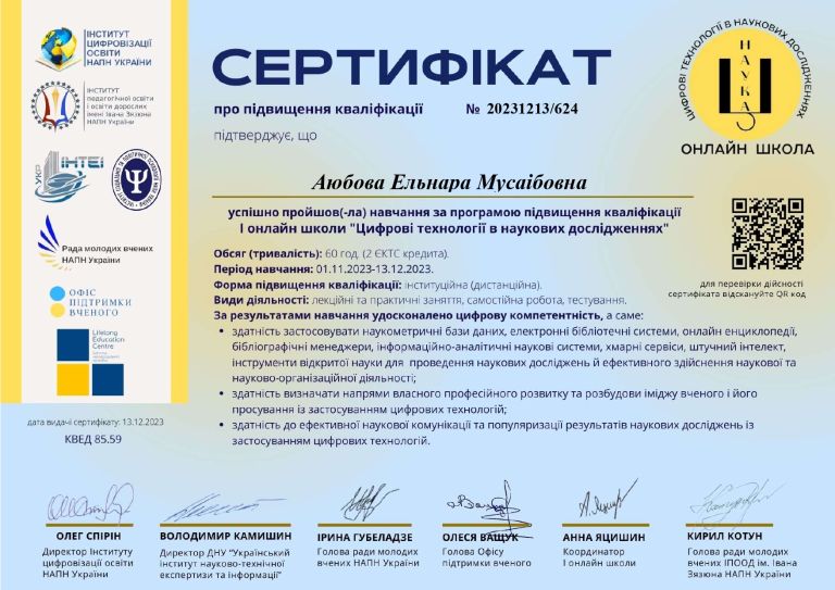 ГО «Prometheus», American Councils. Сертифікат про завершення онлайн-курсу, виданий 24.03.2024 р. Тема: «Академічна доброчесність: онлайн-курс для викладачів», обсягом 60 годин (2 кредити ЄКТС).Визнано підвищенням кваліфікації (наказ ректора ТДАТУ №104-ІПК від 31.05.2024 р.)