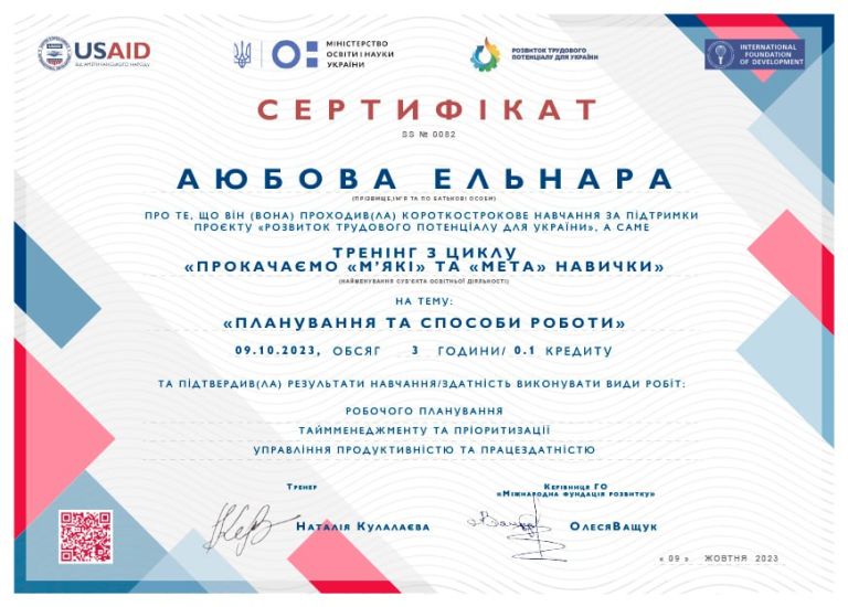 ГО «Міжнародна фундація розвитку» (м.Київ, Україна). Сертифікат про короткострокове навчання SS № 0082 від 09.10.2023 р. Тема: «Планування та способи роботи», обсягом 3 години (0,1 кредиту ЄКТС). Визнано підвищенням кваліфікації (наказ №449-ІПК від 28.12.2023 р.)