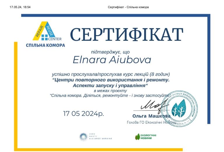 ГО «Екологічні новини» (м. Херсон, Україна). Сертифікат про завершення курсу, виданий 17.05.2024 р. Тема: «Центри повторного використання і ремонту. Аспекти запуску і управління» (проєкт «Спільна комора» за підтримки Zero Waste Alliance Ukraine), обсягом 8 годин (0,27 кредиту ЄКТС). Визнано підвищенням кваліфікації (наказ ректора № 243-ІПК від 30.06.2025 р.)