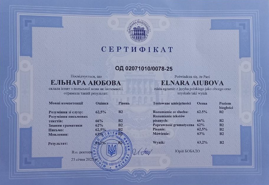 Підвищення іншомовних компетенцій. Національний університет «Львівська політехніка» (м. Львів, Україна), Сертифікат про складення іспиту №ОД 02071010/0078-25 від 23.01.2025 р. Тема: «Польська мова рівень В2», обсягом 3 кредити ЄКТС. Визнано підвищенням кваліфікації (наказ ректора ТДАТУ №82-ІПК від 07.04.2025 р.)
