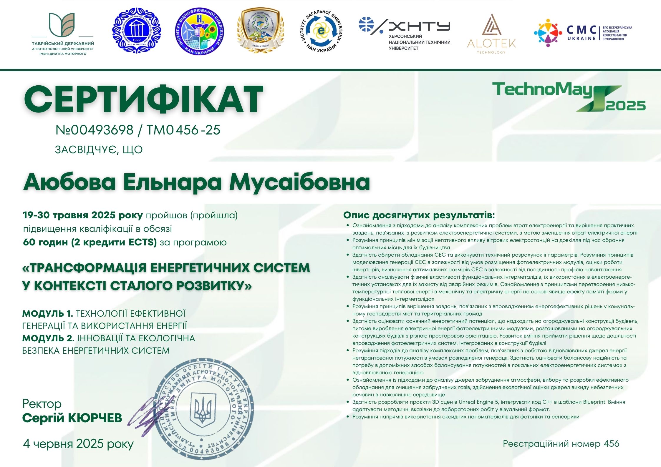 ТОВ «ЕДЮКЕЙШНАЛ ЕРА» (м. Київ, Україна). Сертифікат про підвищення кваліфікації, виданий 23.12.2024 р. Тема: «Корупція-off: як боротися з корупційними ризиками у вищій освіті», обсягом 10 годин (0,3 кредиту ЄКТС). Визнано підвищенням кваліфікації (наказ ректора ТДАТУ №79-ІПК від 07.04.2025 р.)