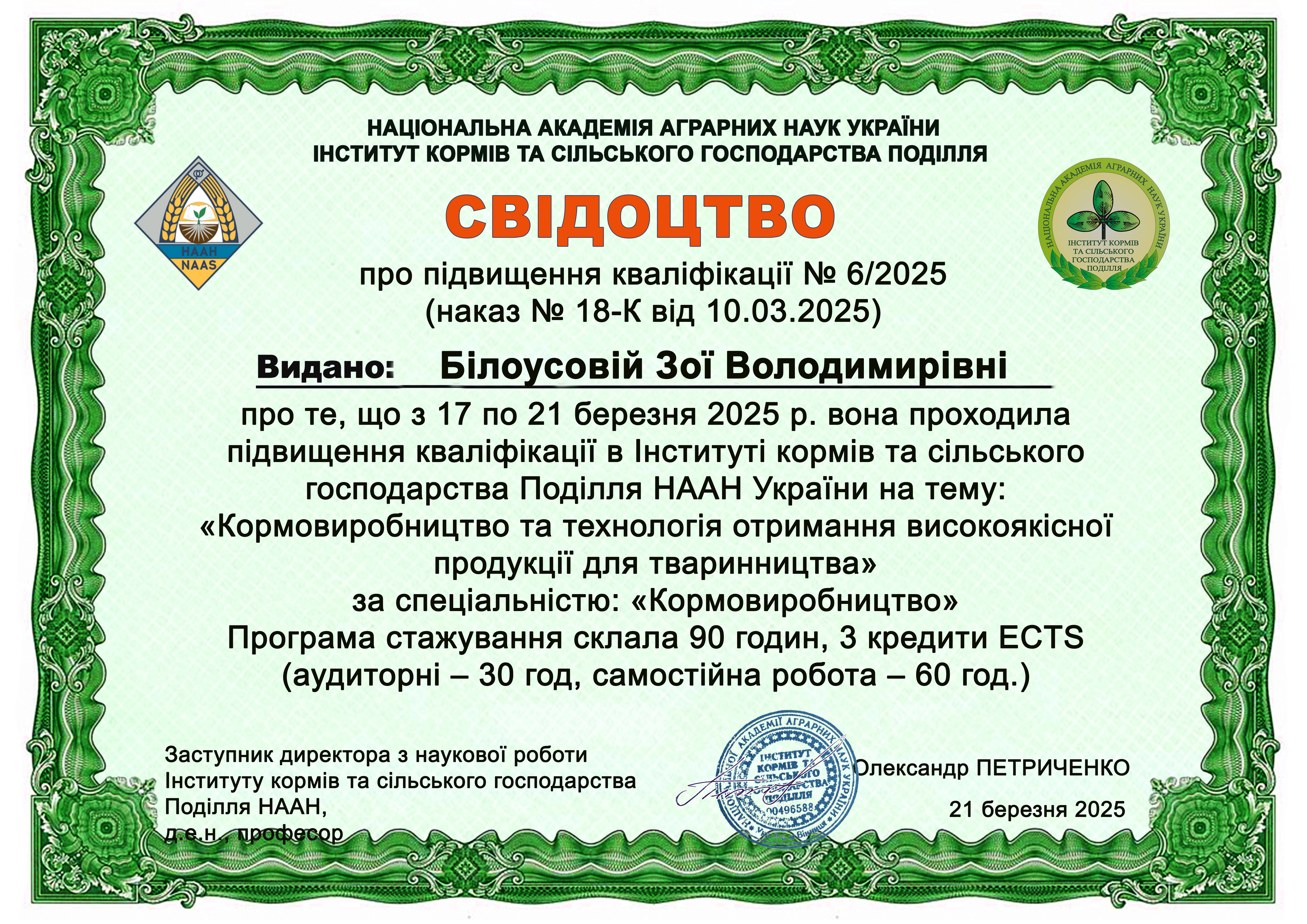ГО “Асоціація “Український клуб аграрного бізнесу” (м. Київ, Україна), ОП “Агрокебети”. Сертифікат про підвищення кваліфікації, отриманий у листопаді 2023 р. Тема “Менторство в Агро” (проєкт USAID “Економічна підтримка України”), обсягом 180 годин (6 кредитів ЄКТС). Визнано підвищенням кваліфікації (наказ ректора ТДАТУ №79-ІПК від 07.04.2025 р.)
