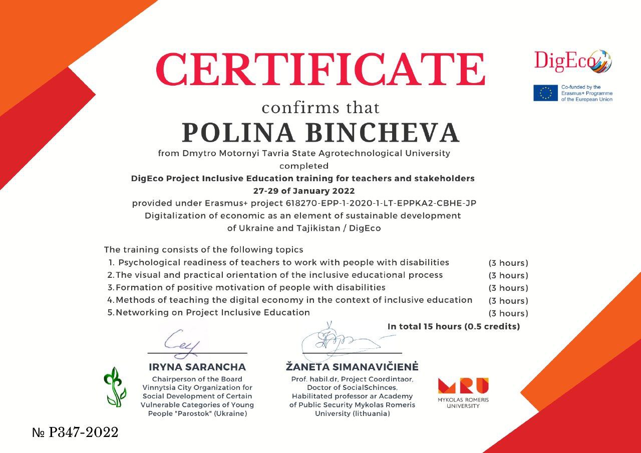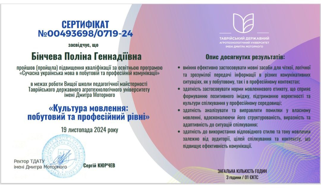 Вища школа управління охороною праці у Катовіцах (WSZOP) (Katowice, Польща). Сертифікат про участь у вебінарі, виданий 12.12.2024 р. Тема: «Сучасні технології і їх вплив у комунікації», обсягом 3 години (0,1 кредиту ЄКТС). Визнано підвищенням кваліфікації (наказ ректора № 243-ІПК від 30.06.2025 р.)