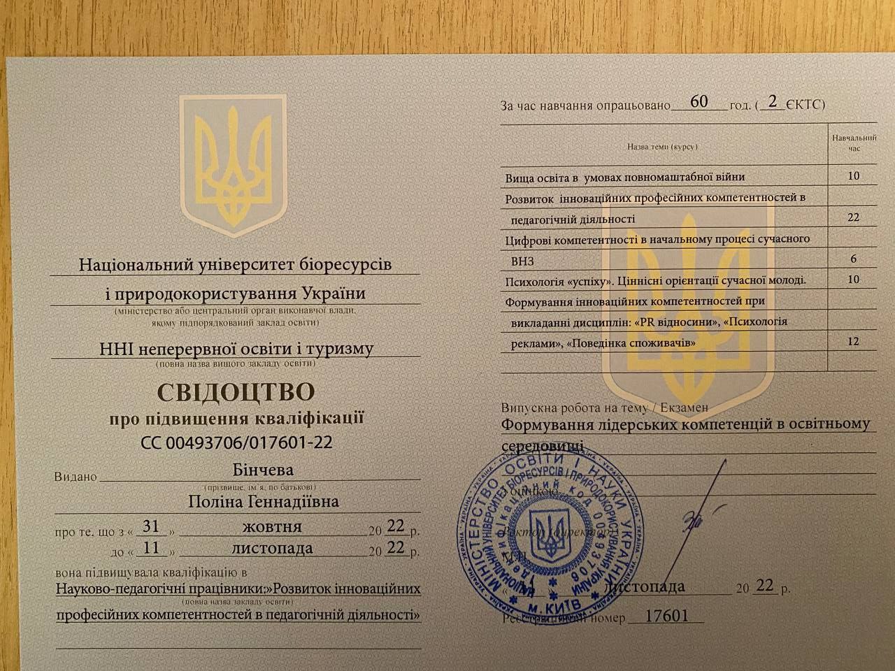 UGEN (м. Київ, Україна). Сертифікат про участь у проєкті №125 від 28.02.2025 р. Тема: «Uni-Biz Bridge: Skills in focus», обсягом 7 годин (0,23 кредиту ЄКТС). Визнано підвищенням кваліфікації (наказ ректора № 243-ІПК від 30.06.2025 р.)