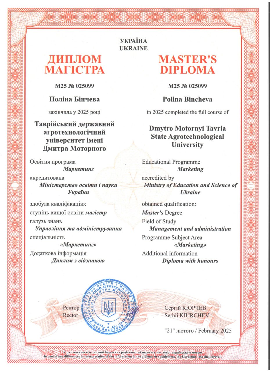 Друга вища освіта. Таврійський державний агротехнологічний університет імені Дмитра Моторного (м. Запоріжжя, Україна). Диплом магістра М25 №025099 від 21.02.2025 р. Освітня програма: “Маркетинг”, обсягом 3 кредити ЄКТС. Визнано підвищенням кваліфікації (наказ ректора ТДАТУ №355-ІПК від 06.10.2025 р.)
