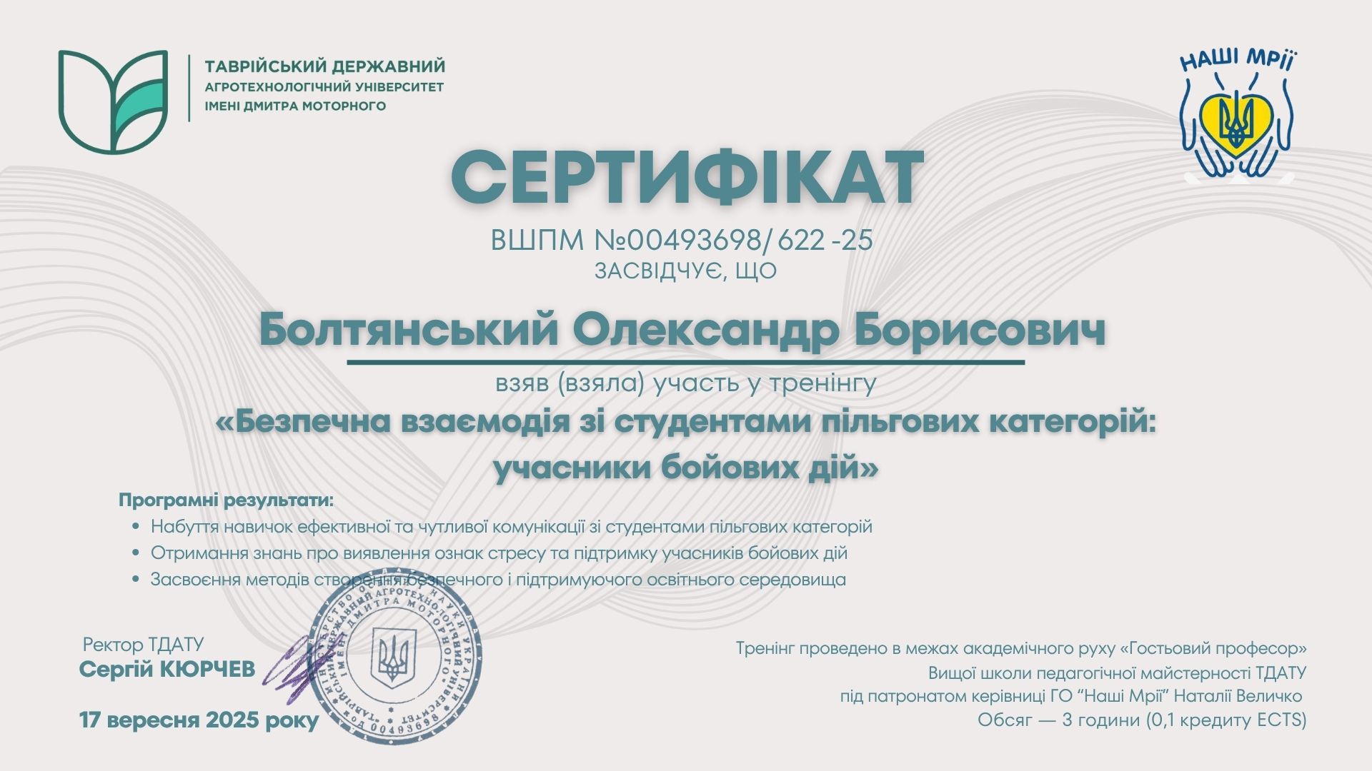 Болтянський Олександр Борисович Підвищення кваліфікації, стажування за останні 5 років 2025 рік Таврійський державний агротехнологічний університет ім. Дмитра Моторного (м.Запоріжжя, Україна). Сертифікат про підвищення кваліфікації №00493698/ТО0675-25 від 23.10.2025 р. Тема: “Сучасні технології та педагогічні практики”, обсягом 30 годин (1 кредит ЄКТС). ВШПМ. Таврійський державний агротехнологічний університет імені Дмитра Моторного (м. Запоріжжя, Україна), ГО “Наші Мрії” (м.Запоріжжя, Україна). Сертифікат про підвищення кваліфікації ВШПМ №00493698/0622-25 від 17.09.2025 р. Тема: “Безпечна взаємодія зі студентами пільгових категорій: учасники бойових дій”, обсягом 3 години (0,1 кредиту ЄКТС). Підвищення кваліфікації у попередні періоди —