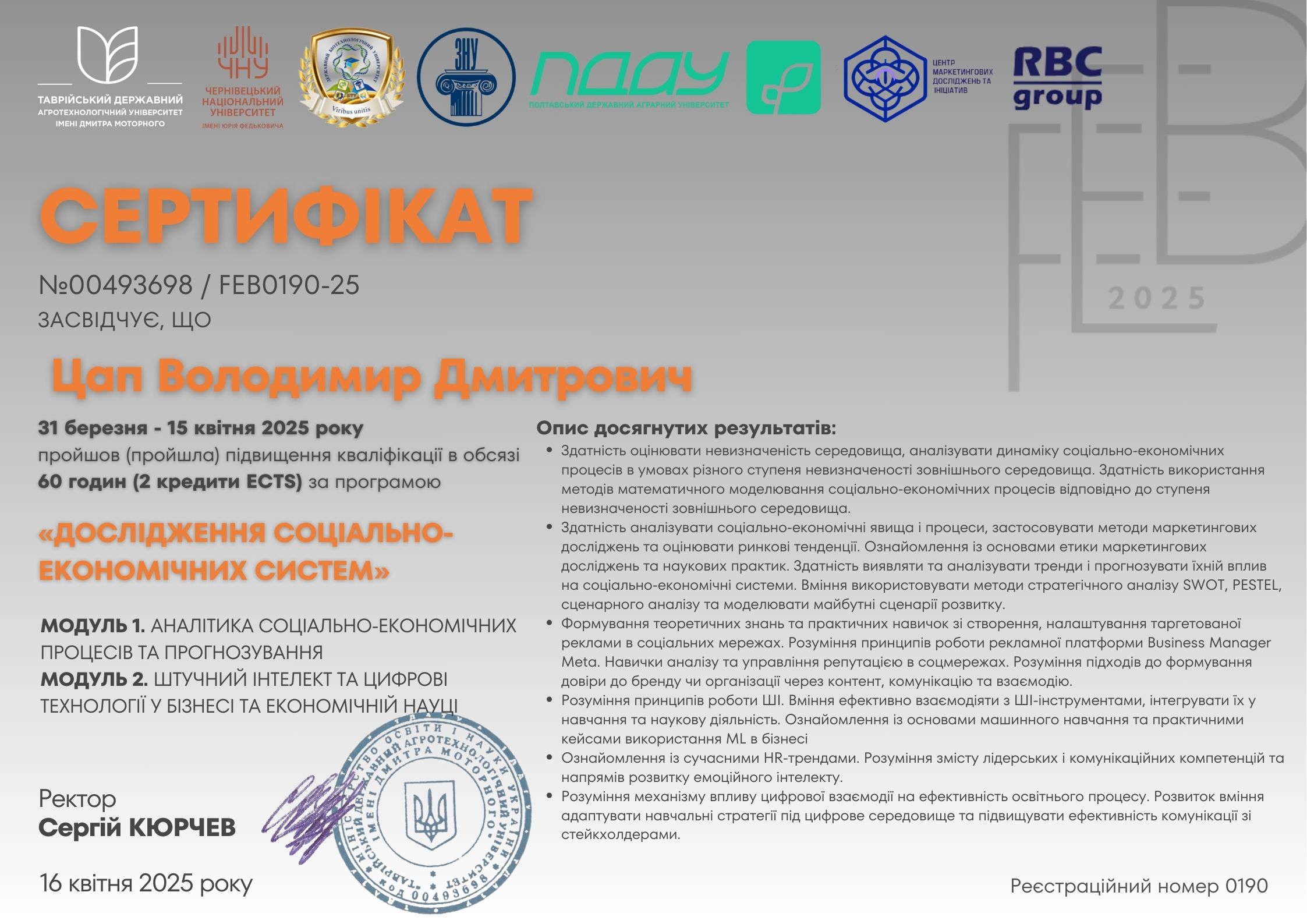 Міжнародне стажування. Університет Миколаса Ромеріса (м. Вільнюс, Литва). Сертифікат про завершення міжнародного онлайн-тренінгу №TRAIN-2025-207 від 18.07.2025 р. Тема: “Мислення, засноване на ШІ, у підприємницьких сферах” (в межах проєкту EIT HEI-TRAIN: Трансформація ВНЗ для підприємництва та інновацій на основі ШІ), обсягом 180 годин (6 кредитів ЄКТС). Визнано підвищенням кваліфікації (наказ ректора ТДАТУ №355-ІПК від 06.10.2025 р.)