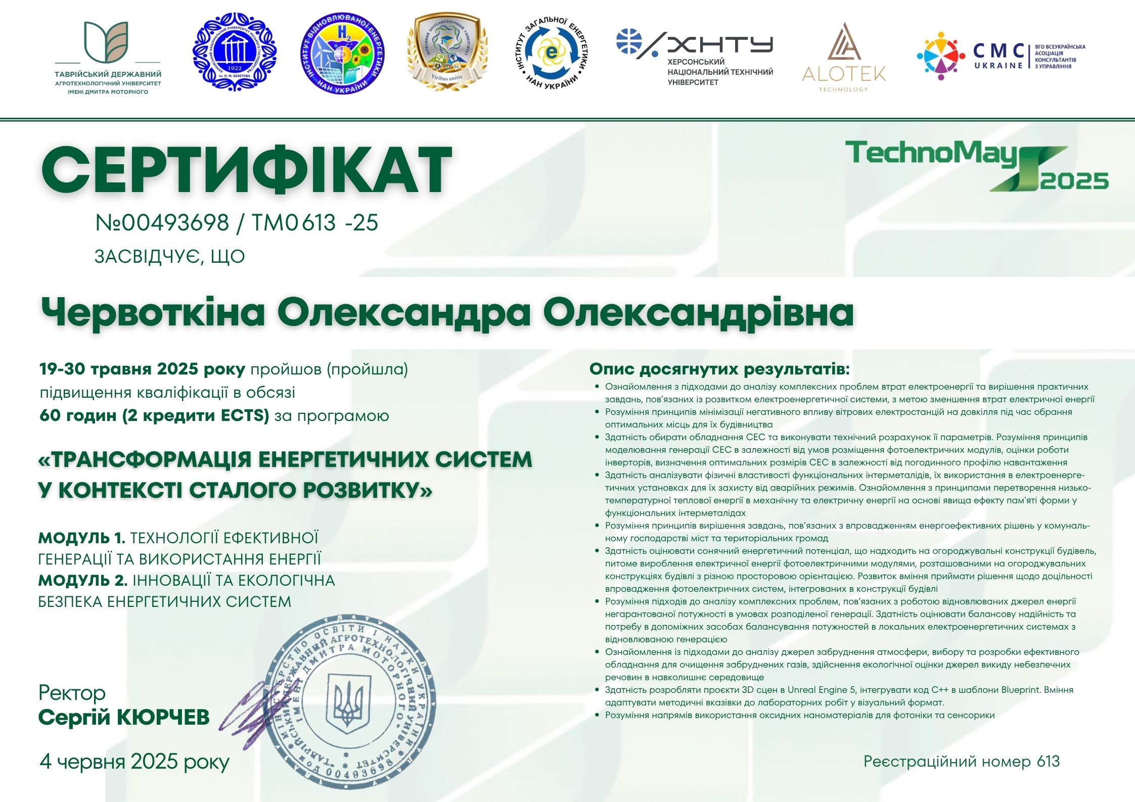 ТДАТУ (м. Запоріжжя, Україна), Інститут загальної енергетики НАН України (м. Київ, Україна), Інститут відновлюваної енергетики НАН України (м. Київ, Україна), ХНУМГ (м. Харків, Україна), ДБТУ (м. Харків, Україна), ХНТУ (м. Хмельницький , Україна), ALOTEK (Польща), Всеукраїнська асоціація консультантів з управління CMC-Ukraine (м. Київ, Україна). Сертифікат №00493698 / ТМ0 613-25 від 04.06.2025 р. Тема: “Трансформація енергетичних систем у контексті сталого розвитку”, обсягом 60 годин (2 кредити ЄКТС).
