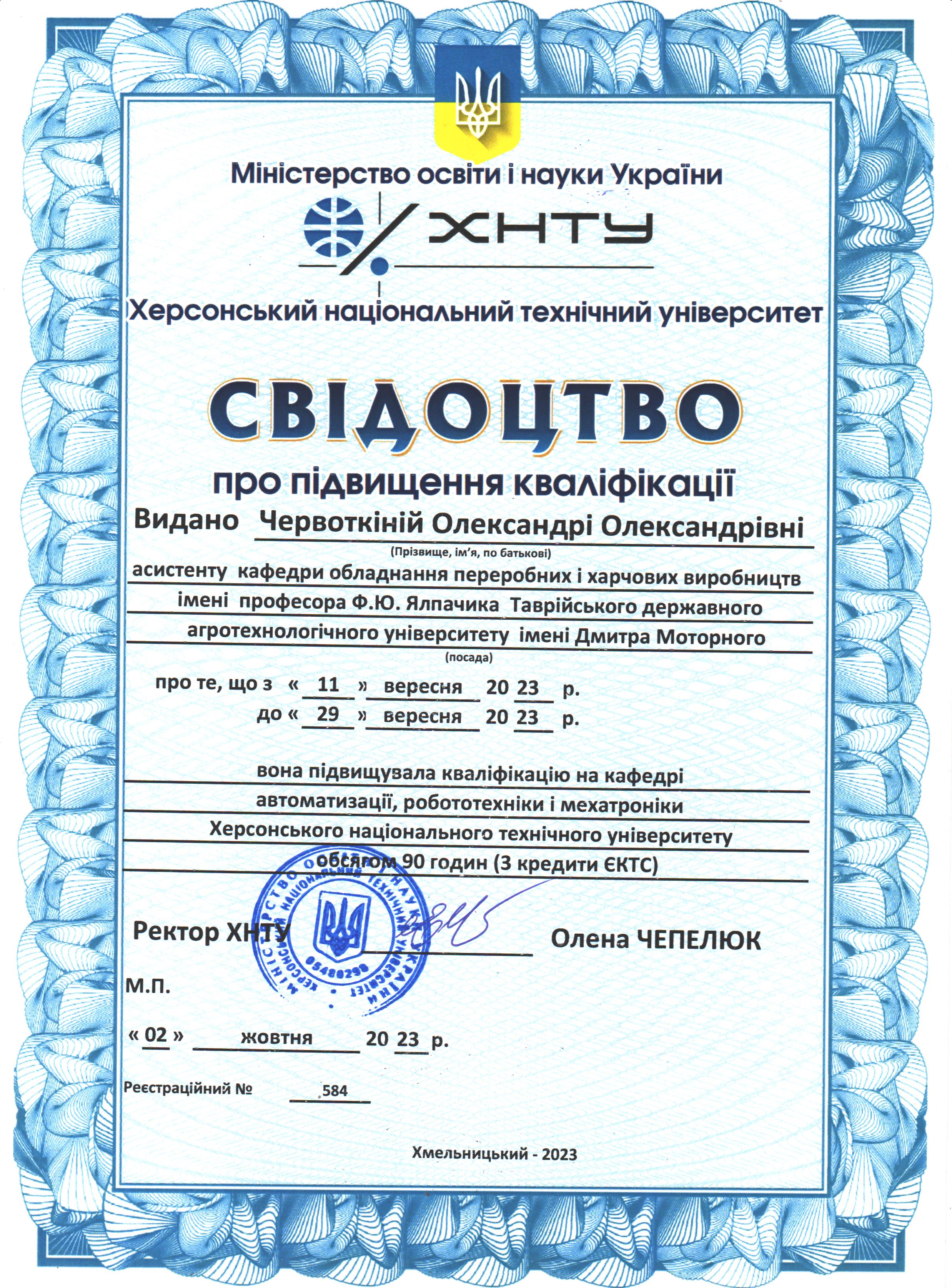 Херсонський національний технічний університет, кафедра автоматизації, робототехніки і мехатроніки. Свідоцтво про підвищення кваліфікації №592 від 02.10.2023 р. Напрям підвищення кваліфікації (стажування): «Розвиток професійних компетентностей у галузі галузевого машинобудування», 90 годин (3 кредити ЄКТС).