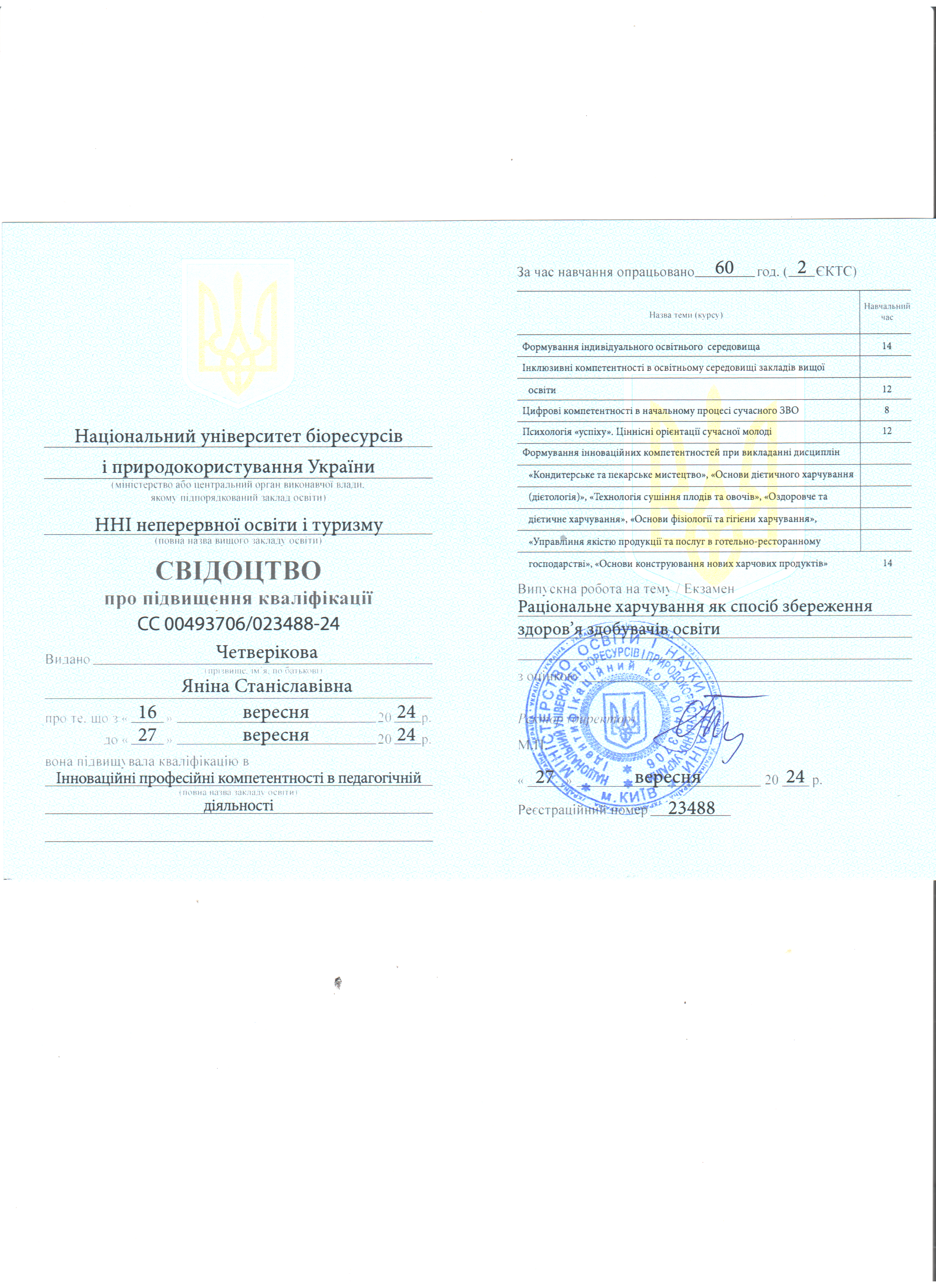 Національний університет біоресурсів і природокористування України, ННІ неперервної освіти і туризму (м.Київ, Україна). Свідоцтво про підвищення кваліфікації СС 00493706/023488-24 №23488 від 27.09.2024 р. Тема: «Інноваційні професійні компетентності в педагогічній діяльності», обсягом 60 годин (2 кредити ЄКТС).