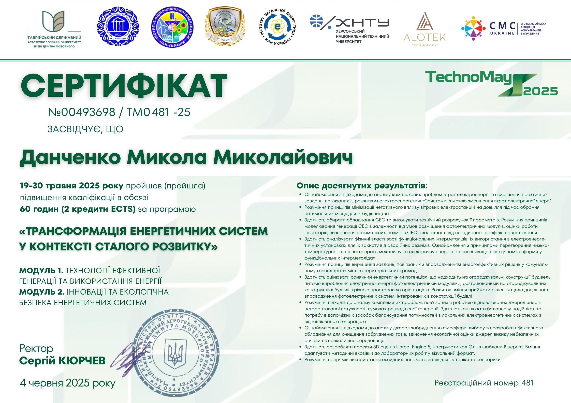 Міжнародне стажування. Wageningen University & Research (Вагенінген, Нідерланди). Довідка про міжнародне стажування від 18.04.2023 р. Тема: “Innovations in organization of the educational process and scientific research at Wageningen University (WU) in the field of Food Science”, обсягом 6 кредитів ЄКТС. Визнано підвищенням кваліфікації (наказ №382-ІПК від 24.09.2024 р.)