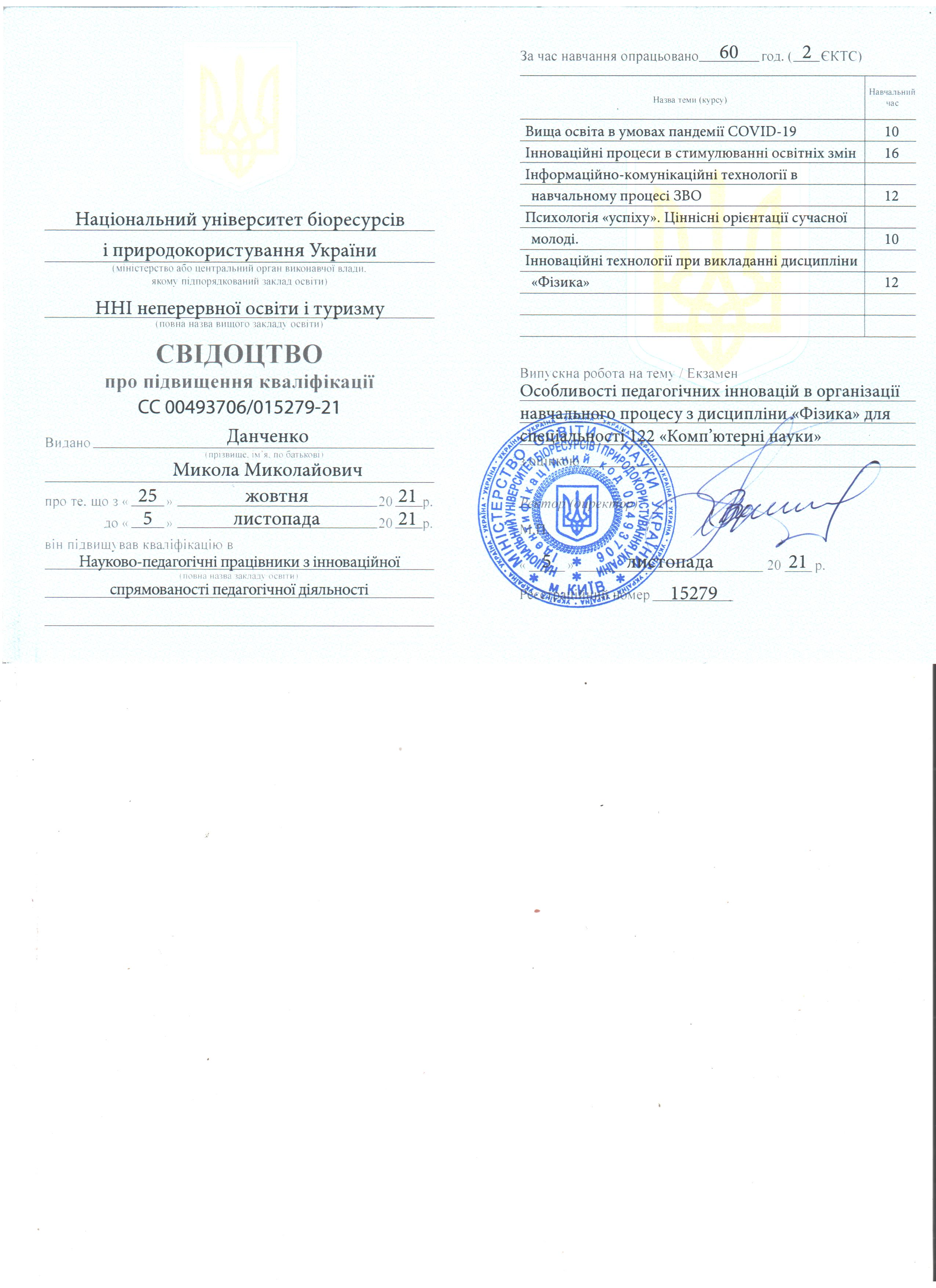 2012 рік. Національний університет біоресурсів і природокористування України ННІ післядипломної освіти, свідоцтво 12 СПК 835036 від 15 червня 2012 р.