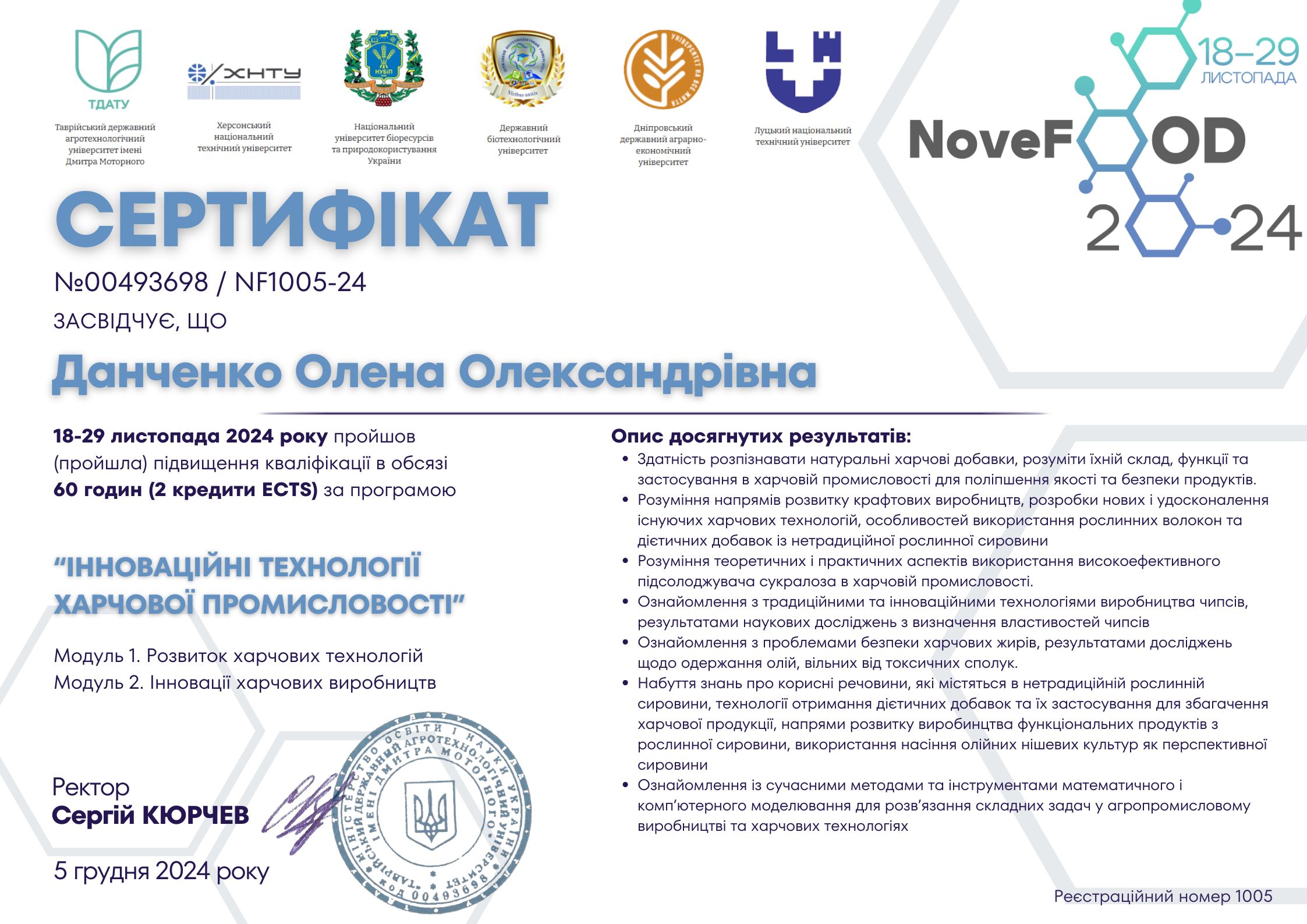 Таврійський державний агротехнологічний університет імені Дмитра Моторного (м.Запоріжжя, Україна), ХНТУ (м.Херсон, Україна), НУБіП (м.Київ, Україна), Державний біотехнологічний університет (м.Харків, Україна), Дніпровський державний аграрно-економічний університет (м.Дніпро, Україна), ЛНТУ (м.Луцьк, Україна). Сертифікат про підвищення кваліфікації №00493698/NF1005-24 від 05.12.2024 р. Тема: «Інноваційні технології харчової промисловості», обсягом 60 годин (2 кредити ЄКТС).