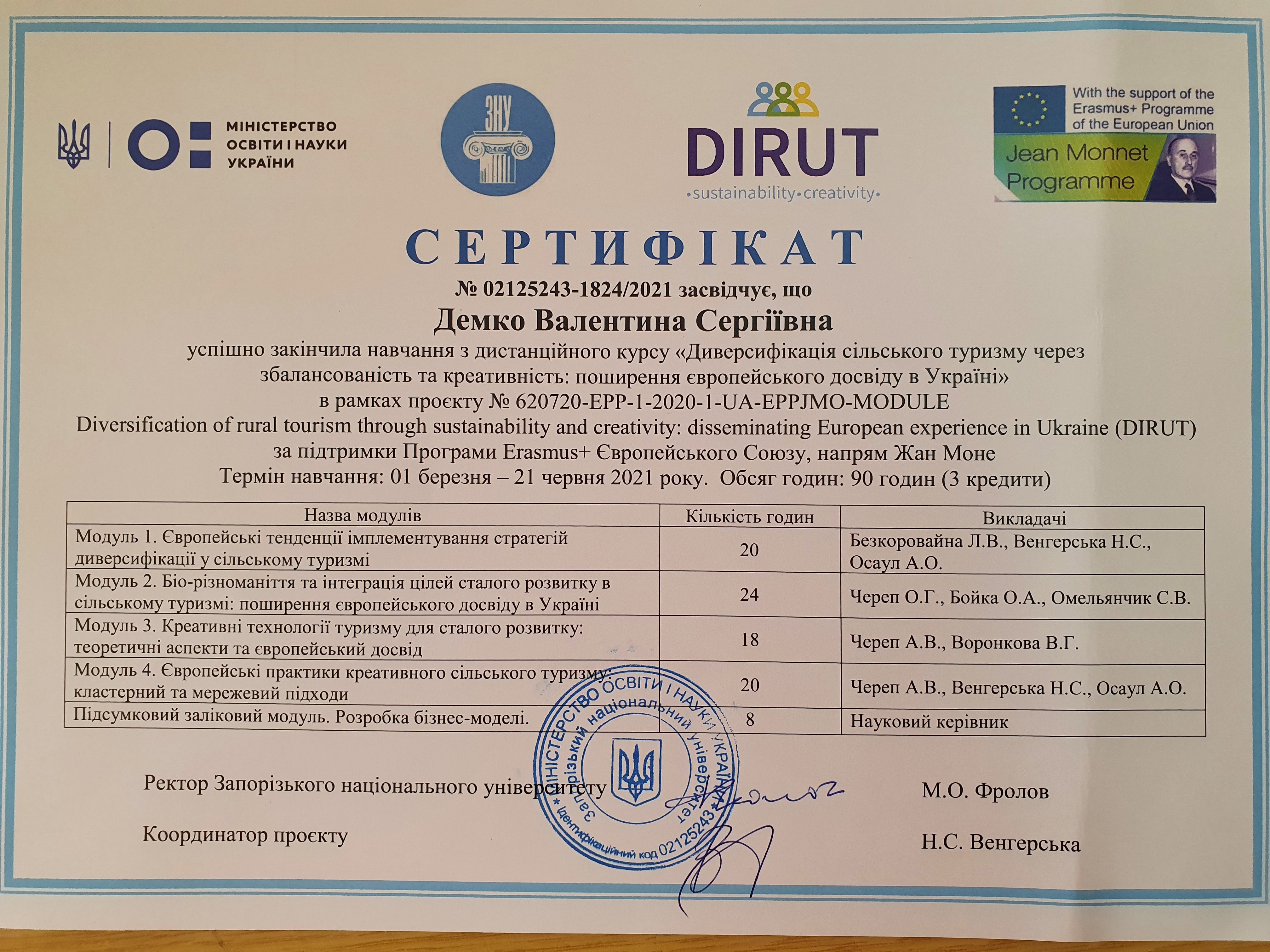Запорізький національний університет (м.Запоріжжя, Україна). Сертифікат №02125243-1824/2021 від 21.06.2021 р. про завершення курсу навчання на тему “Диверсифікація сільського туризму через збалансованість та креативність: поширення європейського досвіду в Україні” за Програмою Еразмус+ Європейського Союзу, напрям Жан Моне з 01.03.2021 р. до 21.06.2021 року, обсягом 90 годин (3 кредити ЄКТС)