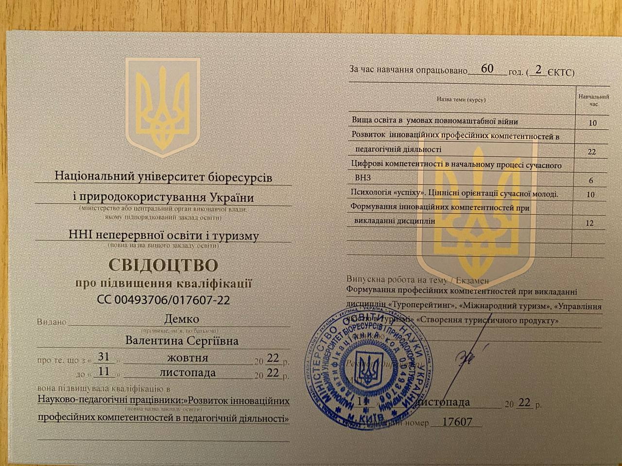 Національний університет біоресурсів і природокористування України, ННІ неперервної освіти і туризму. Свідоцтво про підвищення кваліфікації СС 00493706/017607-22 №17607 від 11.11.2022 р. Тема: «Розвиток інноваційних професійних компетентностей в педагогічній діяльності», 60 годин (2 кредити ЄКТС)