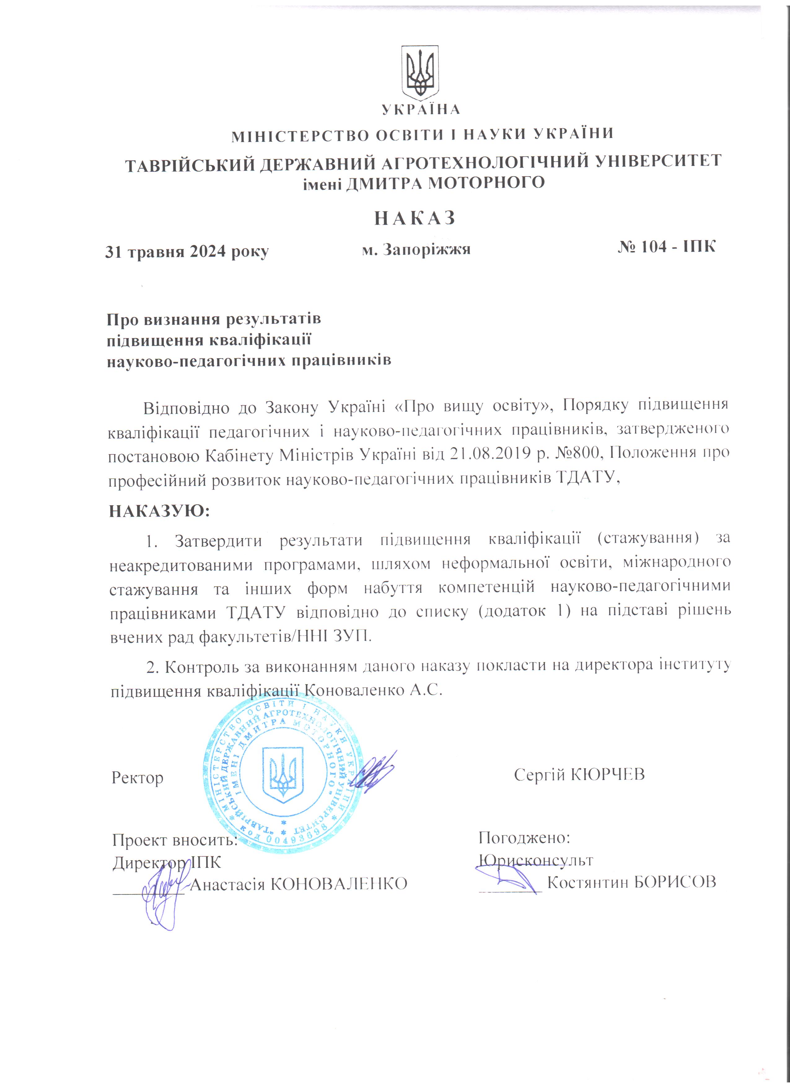 ВШПМ. Таврійський державний агротехнологічний університет імені Дмитра Моторного (м. Запоріжжя, Україна). Сертифікат про підвищення кваліфікації №ВШПМ 00493698/0215-24 від 15.10.2024 р. Тема: «Імплементація патріотичного виховання молоді в навчальну дисципліну» (у межах роботи Вищої школи педагогічної майстерності), обсягом 3 години (0,1 кредиту ЄКТС).