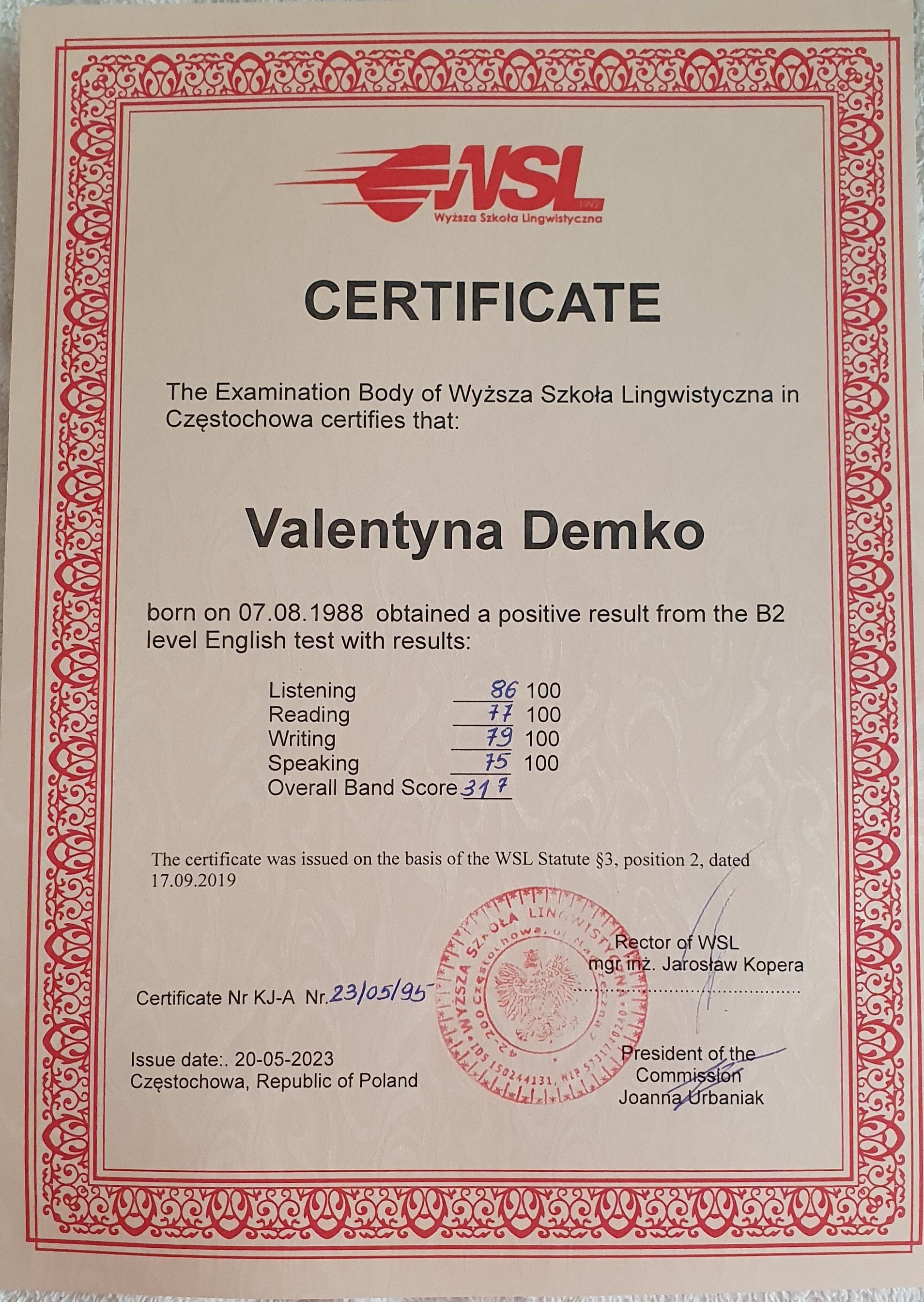 Підвищення іншомовних компетенцій.Wyźsza Szkola Lingwistyczna (Częstochowa, Польща), Сертифікат про проходження тесту № KJ-A 23/05/95 від 20.05.2023 р. Тема: «Тест з англійської мови на рівень В2», обсягом 3 кредити ЄКТС.Визнано підвищенням кваліфікації (наказ ректора ТДАТУ №79-ІПК від 07.04.2025 р.)