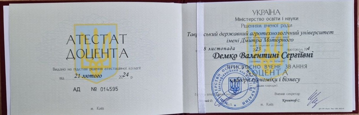 Вчене звання. Міністерство освіти і науки України (м.Київ, Україна). Атестат доцента АД № 014595 від 21.02.2024 р. Вчене звання: «Доцент кафедри економіки і бізнесу», обсягом 3 кредити ЄКТС.Визнано підвищенням кваліфікації (наказ ректора ТДАТУ №104-ІПК від 31.05.2024 р.)