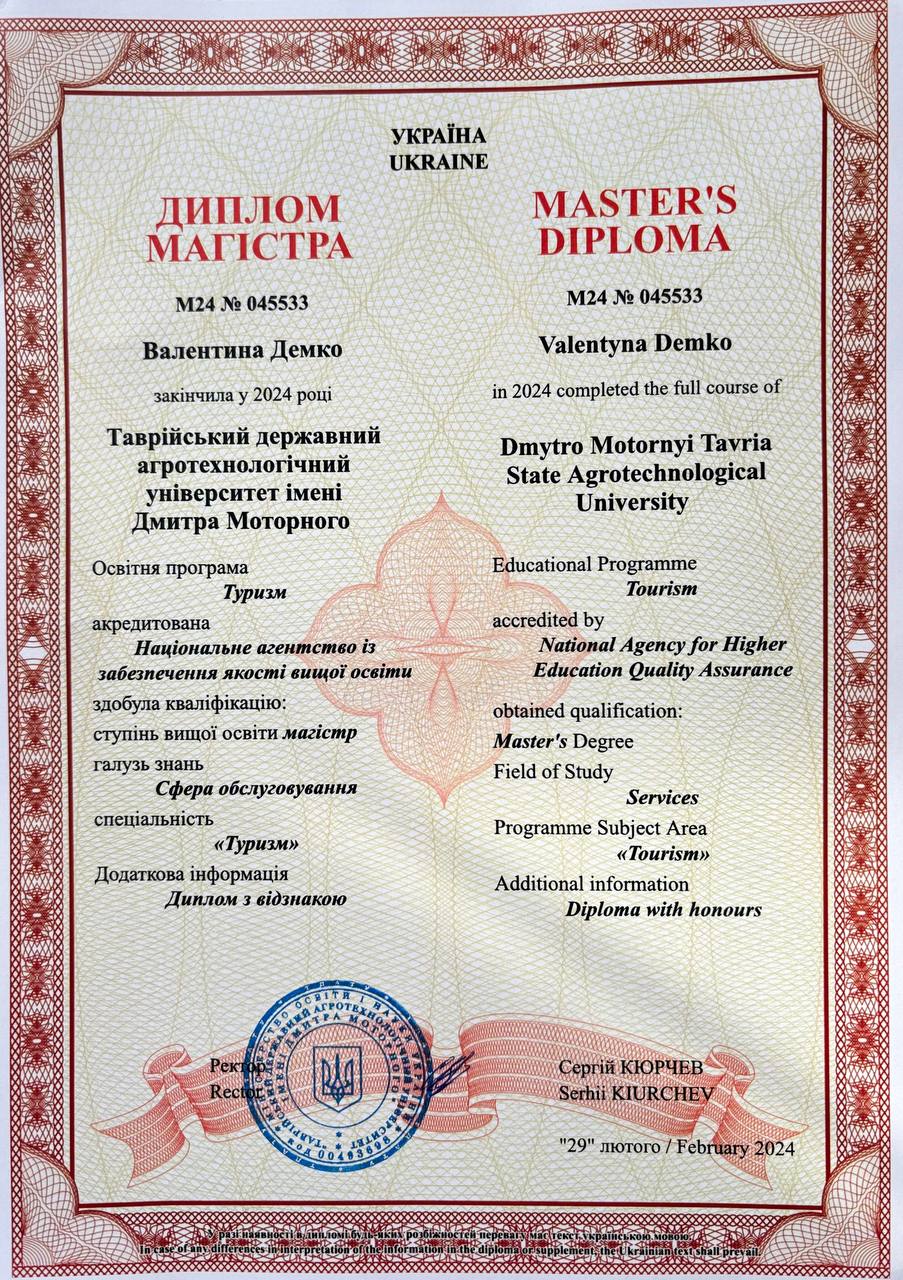 Друга вища освіта. Таврійський державний агротехнологічний університет імені Дмитра Моторного (м.Запоріжжя, Україна). Диплом магістра М24 № 045533 від 29.02.2024 р. ОП: «Туризм», обсягом 3 кредити ЄКТС.Визнано підвищенням кваліфікації (наказ ректора ТДАТУ №104-ІПК від 31.05.2024 р.)