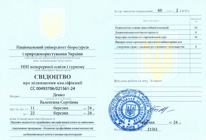 Національний університет біоресурсів і природокористування України, ННІ Неперервної освіти і туризму (м. Київ, Україна). Свідоцтво про підвищення кваліфікації № СС00493706/021561-24 від 22.03.2024 р. Тема: «Розвиток професійних компетентностей здобувачів вищої освіти в умовах євроінтеграції», обсягом 60 годин (2 кредити ЄКТС).