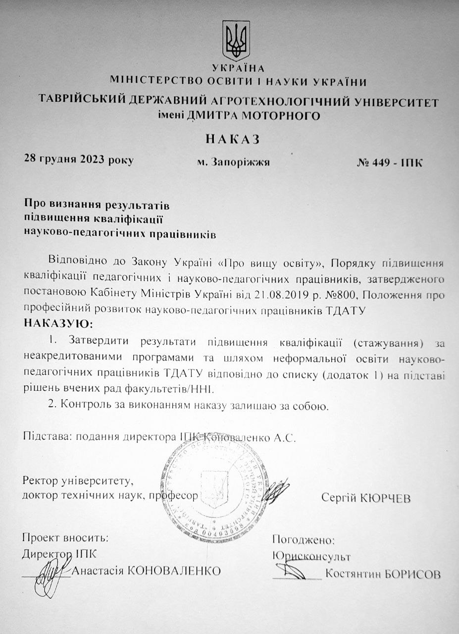 ВШПМ. Таврійський державний агротехнологічний університет імені Дмитра Моторного (м. Запоріжжя, Україна). Сертифікат про підвищення кваліфікації №ВШПМ 00493698/0272-24 від 17.10.2024 р. Тема: «Особливості формування сучасної корпоративної культури» (у межах роботи Вищої школи педагогічної майстерності), обсягом 3 години (0,1 кредиту ЄКТС).