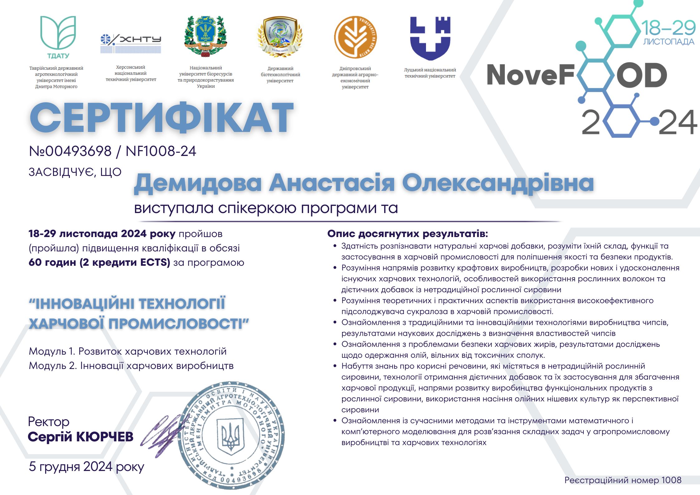 Міжнародне стажування. University of Agriculture in Krakow (URK) (Kraków, Польща), Ukrainian University in Europe – Foundation (UUE-F) (Kraków, Польща). Сертифікат про міжнародне наукове стажування №BWiWM/7230/178/2025 від 09.06.2025 р. Тема: “Харчова безпека: інновації, технології, перспективи”, обсягом 180 годин (6 кредитів ЄКТС). Визнано підвищенням кваліфікації (наказ ректора ТДАТУ №355-ІПК від 06.10.2025 р.)