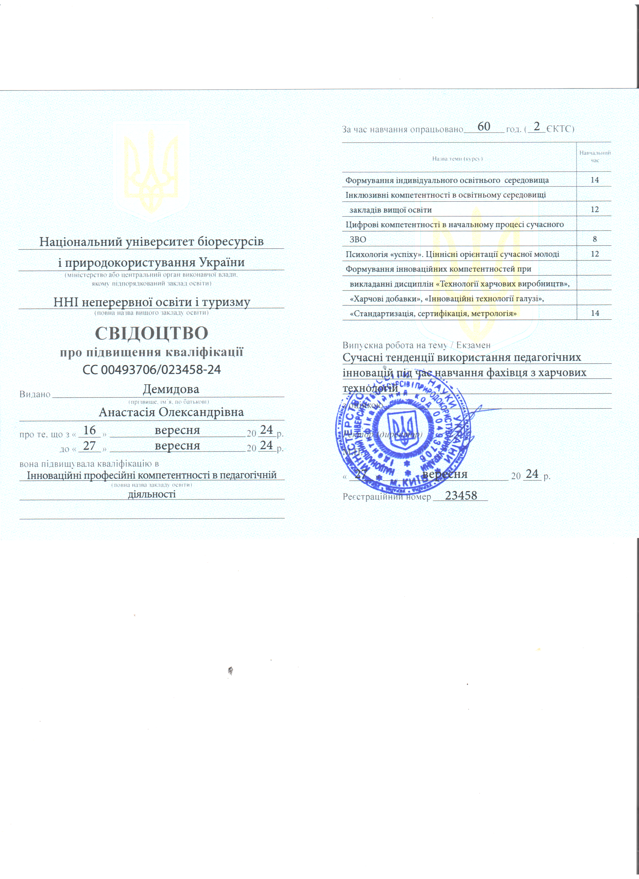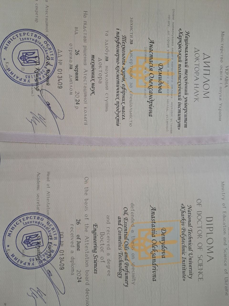 НТУ «Харківський політехнічний інститут» (м.Харків, Україна). Диплом доктора наук ДД № 013409 від 26.06.2024 р. Спеціальність: «Технологія жирів, ефірних масел і парфюмерно-косметичних продуктів», обсягом 3 кредити ЄКТС. Визнано підвищенням кваліфікації (наказ ректора ТДАТУ № 481-ІПК від 27.12.2024 р.)